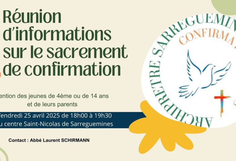 Une réunion d'information pour la confirmation en 2027, pour les jeunes nés en 2012, aura lieu le mercredi 29 avril 2026 de 18h30 à 20h au centre Saint Nicolas de Sarreguemines